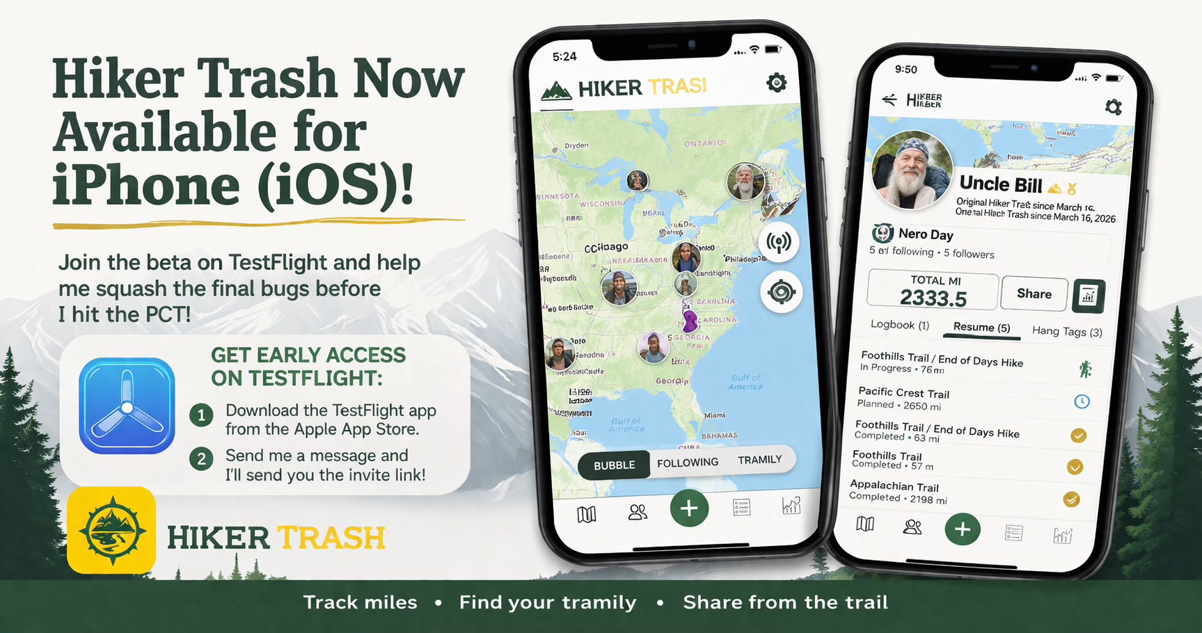 Please send feedback using: Hiker Trash App Support Site if you find bugs!