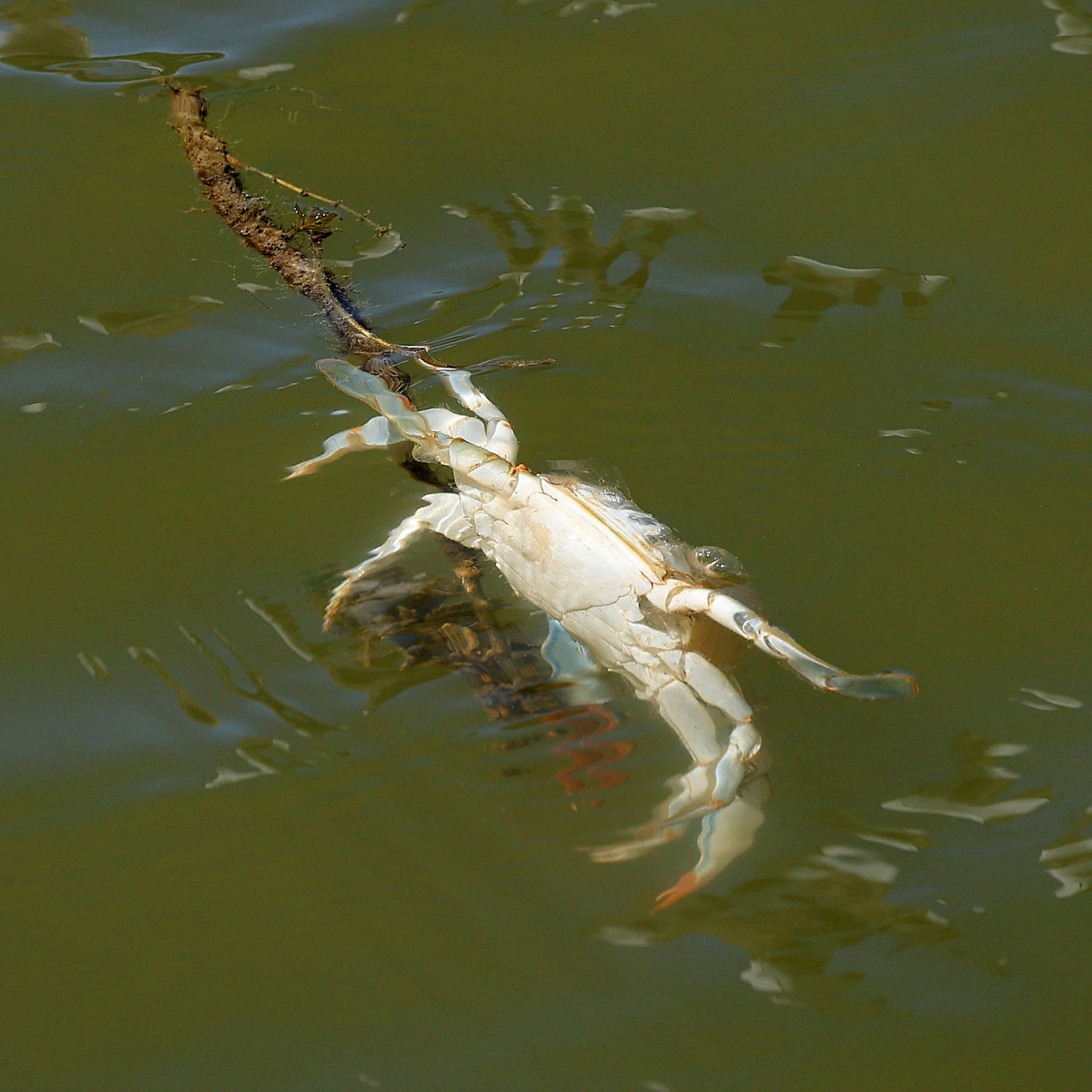 This Maryland Blue Crab may be dying. I have no clue. She was still swimming all over the place while holding onto a stick. Earlier watched two crabs swimming like this (well, one was upside down and one wasn’t) while mating and so maybe this girl was just trying to catch her breath. (Canon R3 & 70-200 f/2.8)